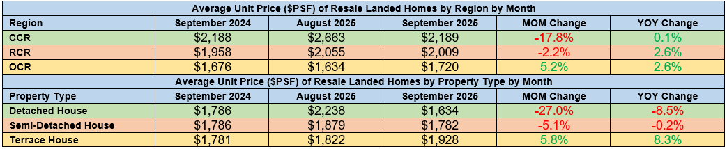 Growth of landed home resale prices in September 2025 was largely uneven. The overall landed homes resale prices dipped by 2.3% month-on-month (MOM) to $1,843 psf; while prices were still up by 3.4% compared to a year before. The month-on-month decrease in resale landed prices was led by the weakening of prices in the Core Central Region (CCR) and Rest of Central Region (RCR) and which fell by 17.8% and 2.2% MOM, respectively. Homes in the Outside Central Region (OCR), bucked the trend, strengthening by 5.2% MOM. By property type, detached and semi-detached homes saw average prices drop sharply by 27% MOM and 5.1% MOM respectively in September. (see table 1 below).