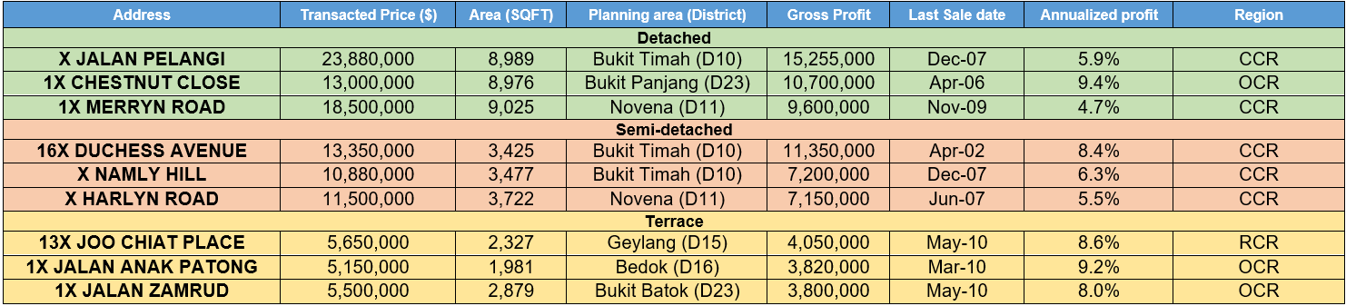 Table 2: Top 3 resale landed transactions by landed property type, in terms of estimated gains*